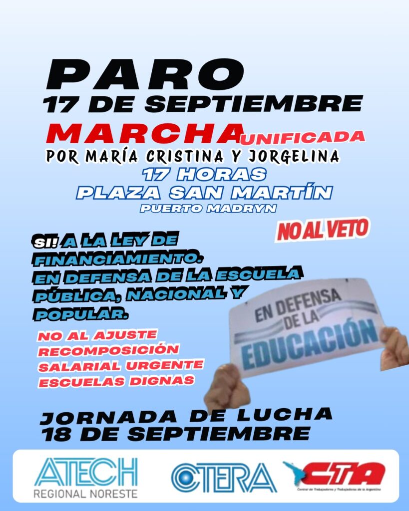 Varios sindicatos que nuclean a docentes y no docentes de Chubut con representación nacional entran anuncian huelga para este próximos días miércoles 17 y  jueves 18 de septiembre. Piden aumento salarial pero también es por “la lucha contra el gobierno provincial y nacional”. EL reclamo es legítimo, la campaña electoral se lanzó; y los chicos no tienen clases en muchas escuelas.