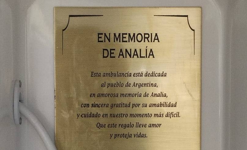 “Esta ambulancia está dedicada al pueblo de Argentina, en amorosa memoria de Analía, con sincera gratitud por su amabilidad y cuidado en nuestro momento más difícil. Que este regalo lleve amor y proteja vidas.”